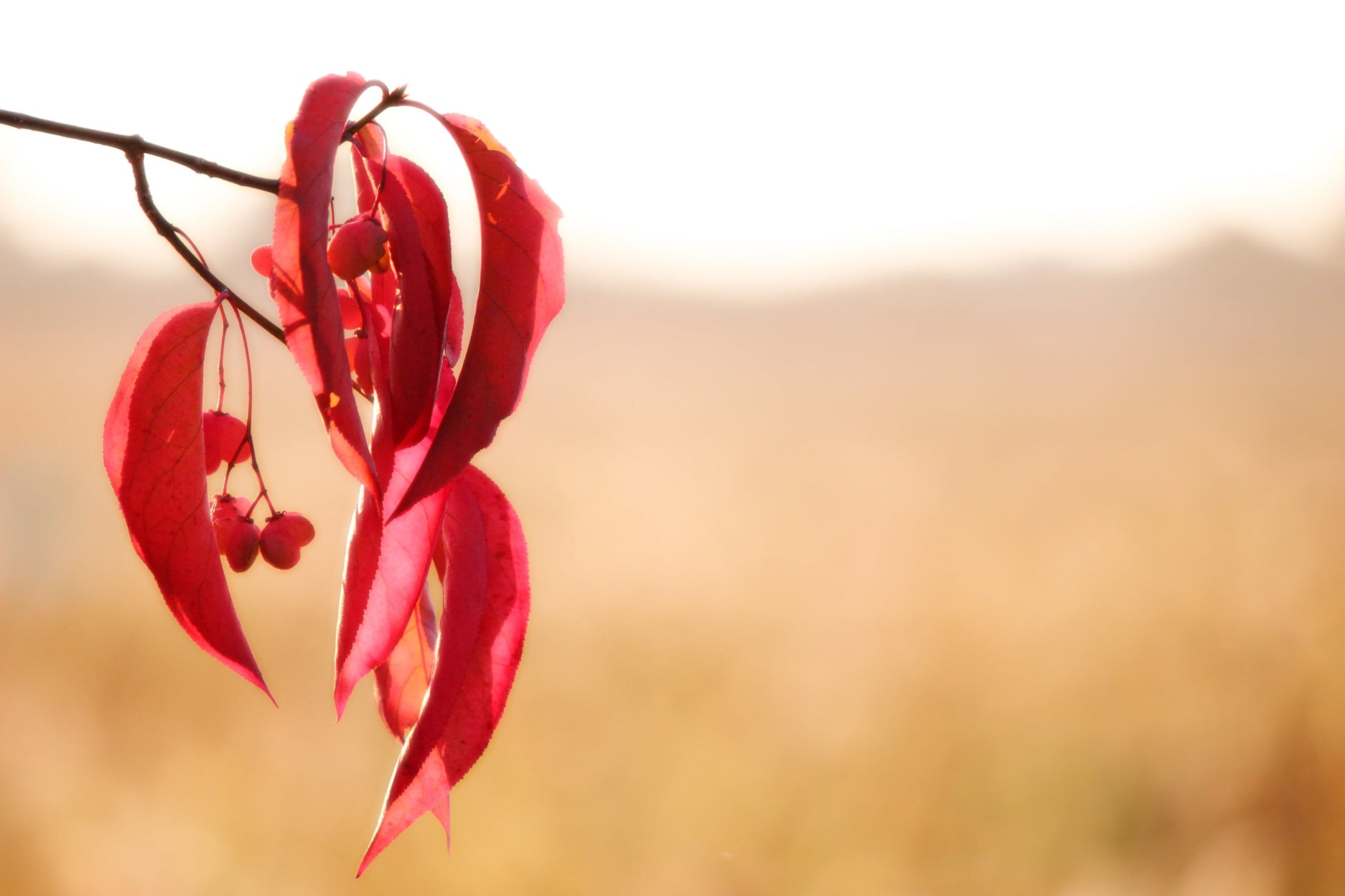 Burning bush leaves and fruit with autumn meadow in background. Scuppernong Springs State Park, WI