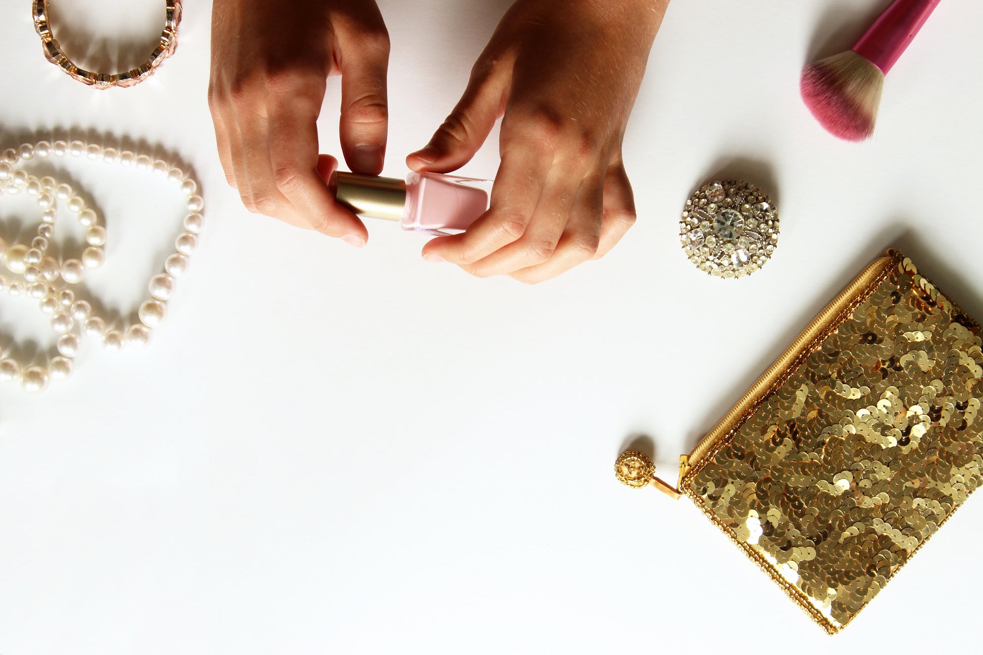 Above flat lay view of cosmetics and jewelry on white background with female hands.