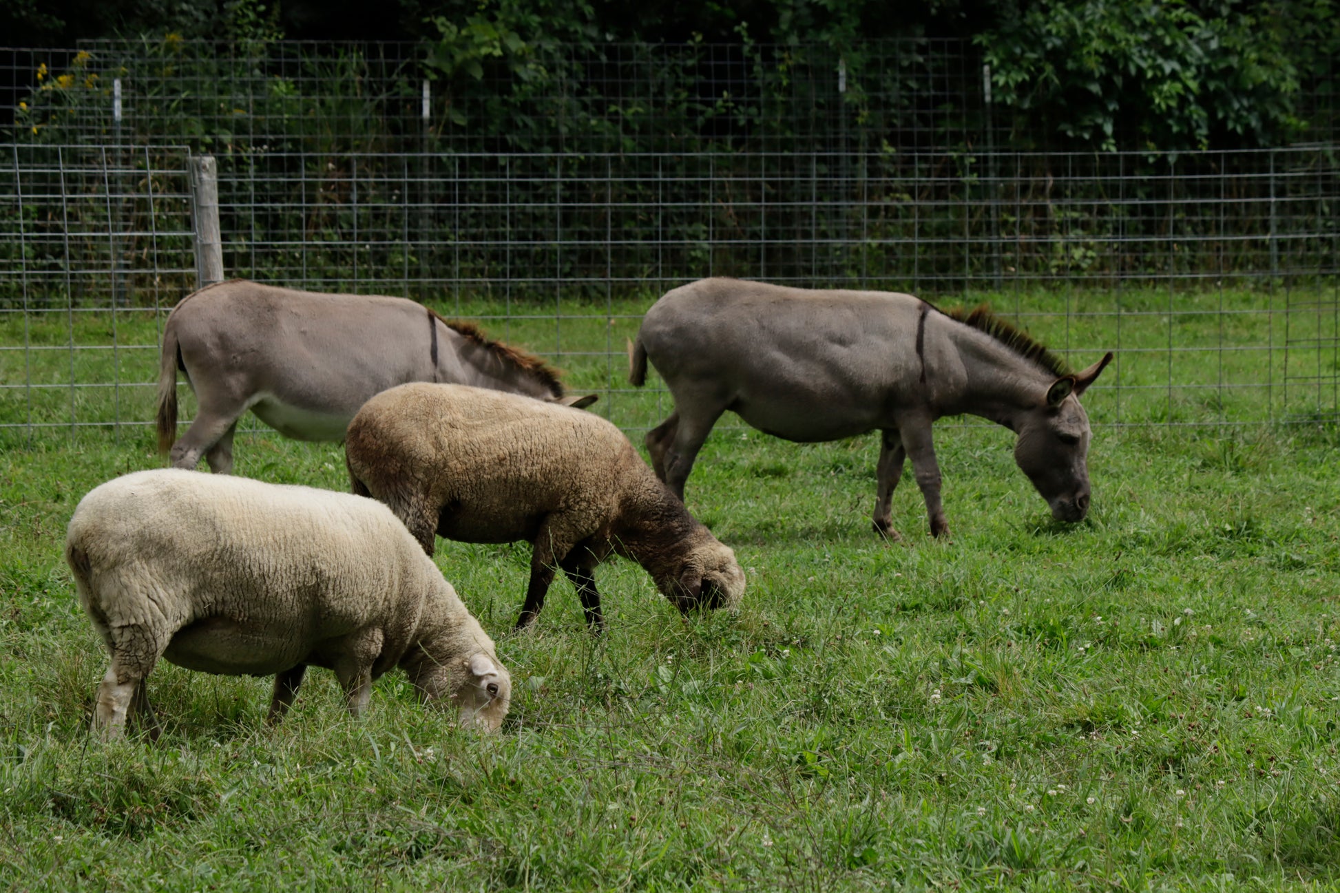 Sheep and donkeys grazing in a pasture.
