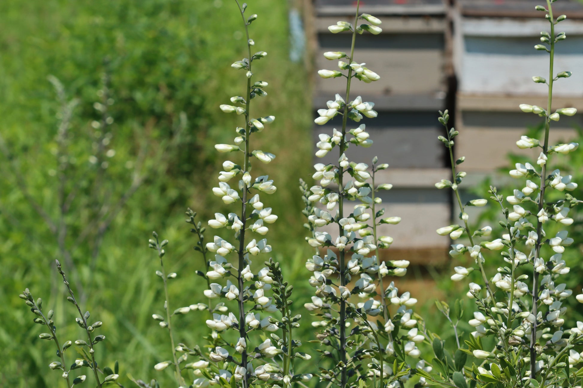 Wild Indigo meadow plants in forefront with bee hives in background.