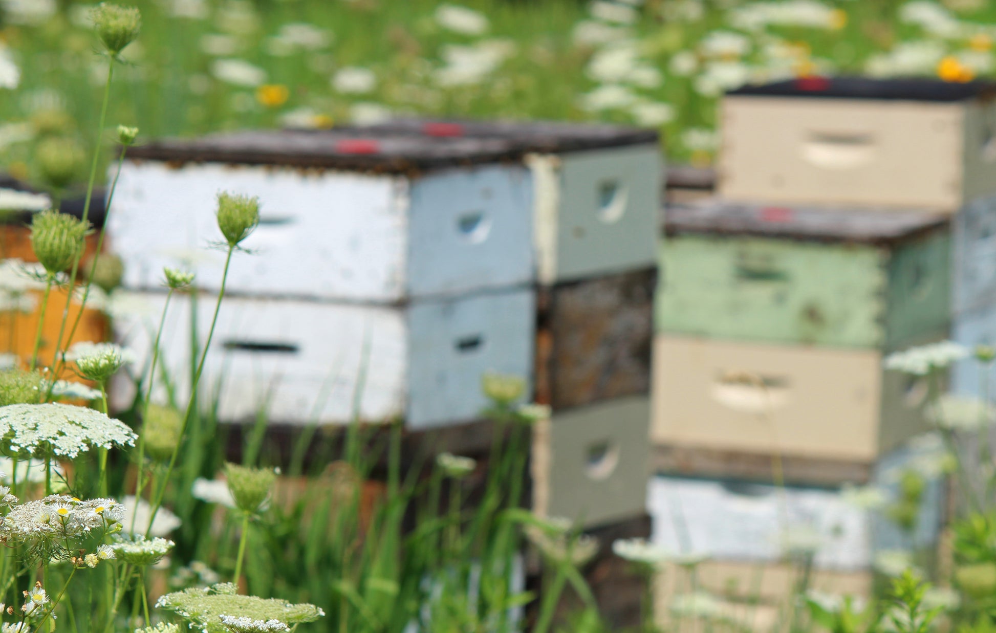 Queen Anne's lace in the foreground with apiary boxes in the background.