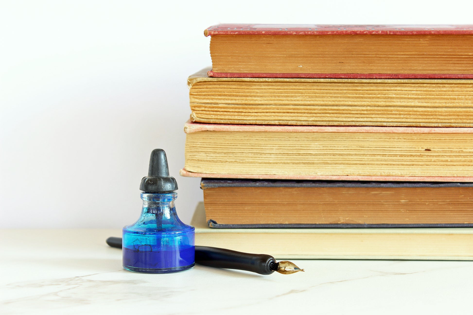 Ink bottle and fountain pen in front of a stack of vintage books. White copy space