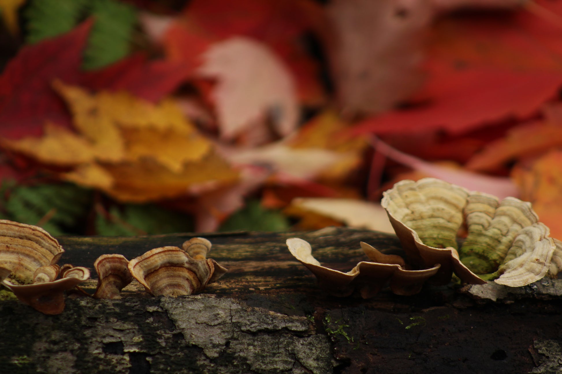 Bracket mushrooms close up on log with autumn colors in the background.