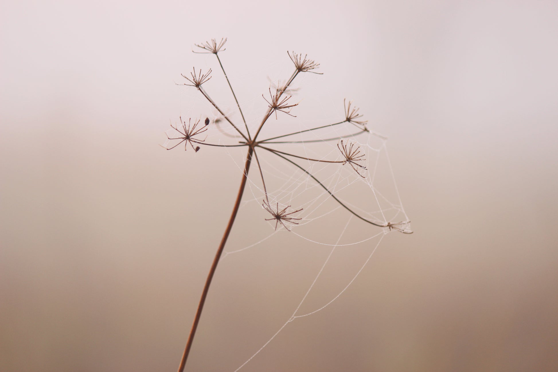 Dried Queen Anne's lace with spider web in misty meadow.