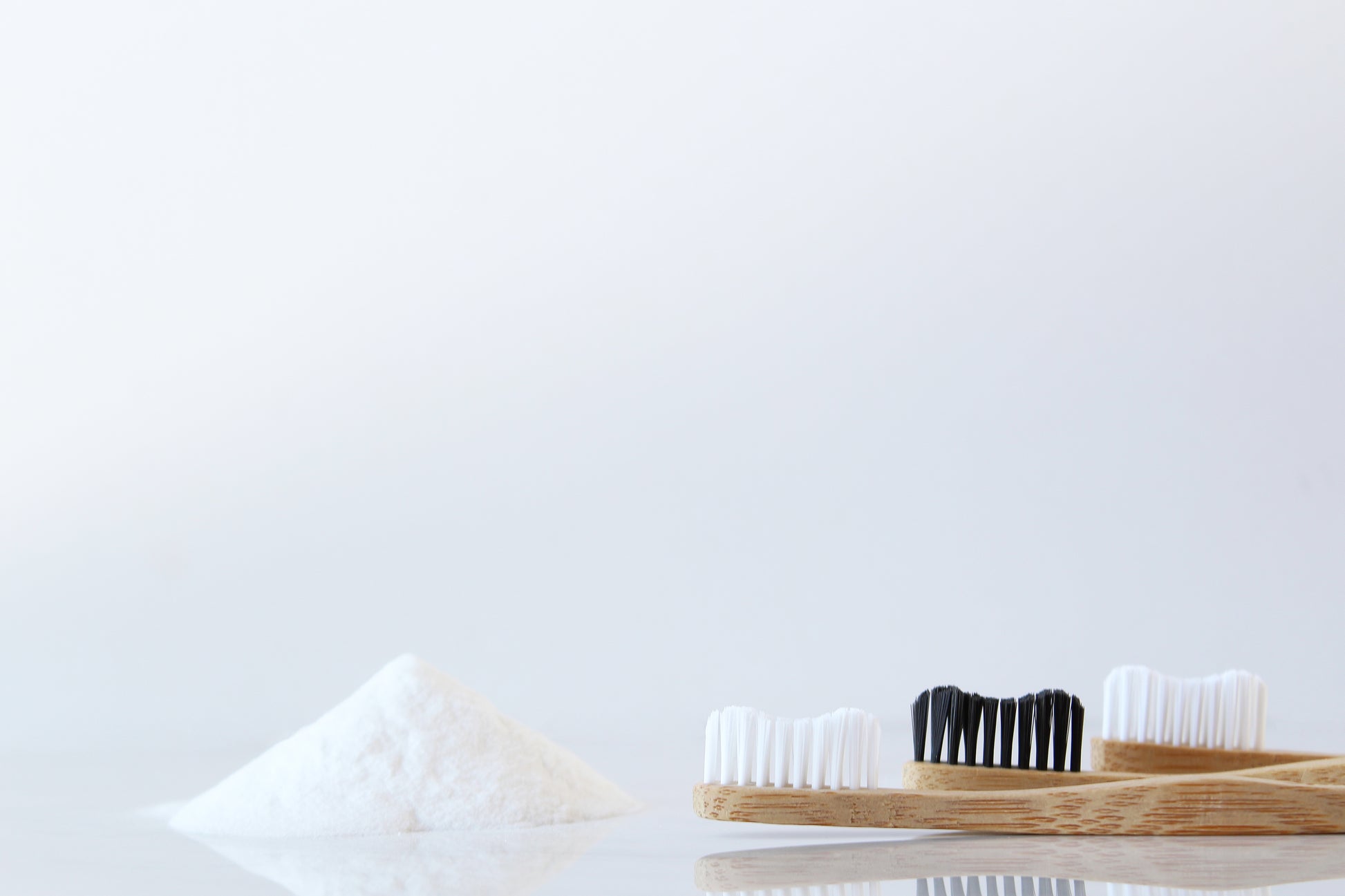 Minimalist view of a pile of baking soda with bamboo toothbrushes. White copy space.