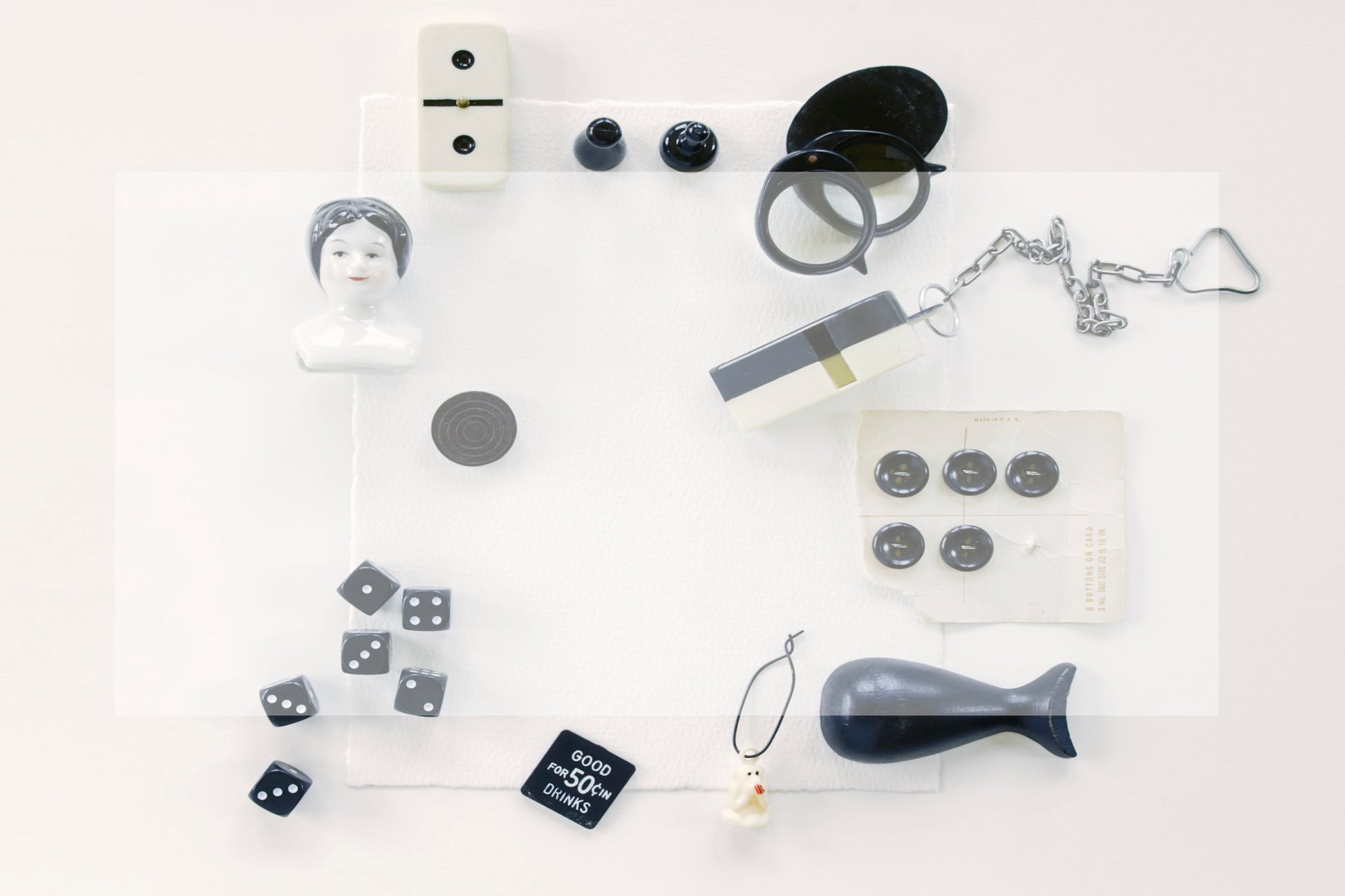 Black and white vintage still life with white handmade paper in the center for copy. Overlay placed over image.