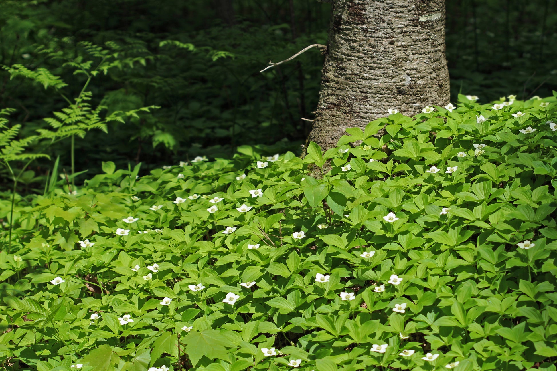 Large group of bunchberry dogwood ground cover patch in a forest.