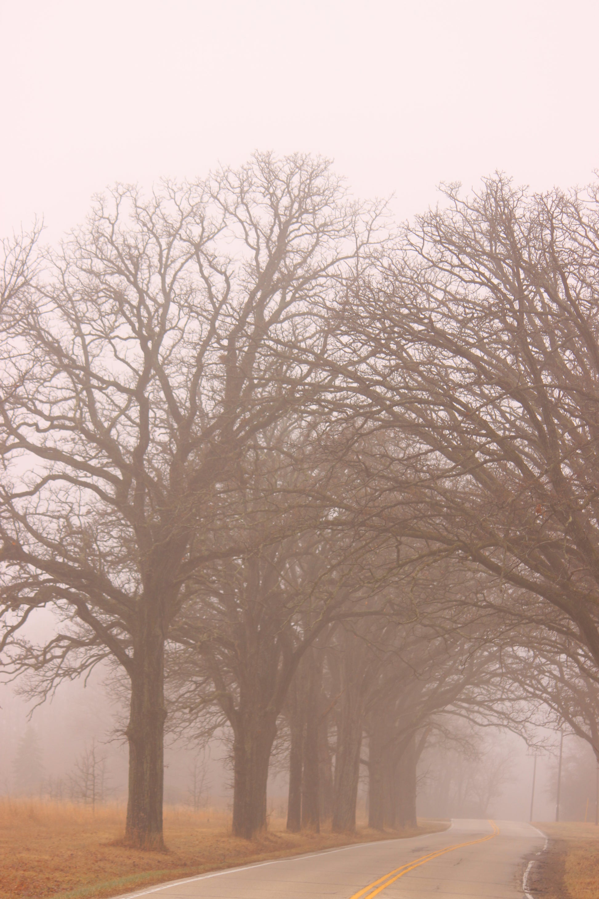 Large trees creating a tunnel over the highway in autumn