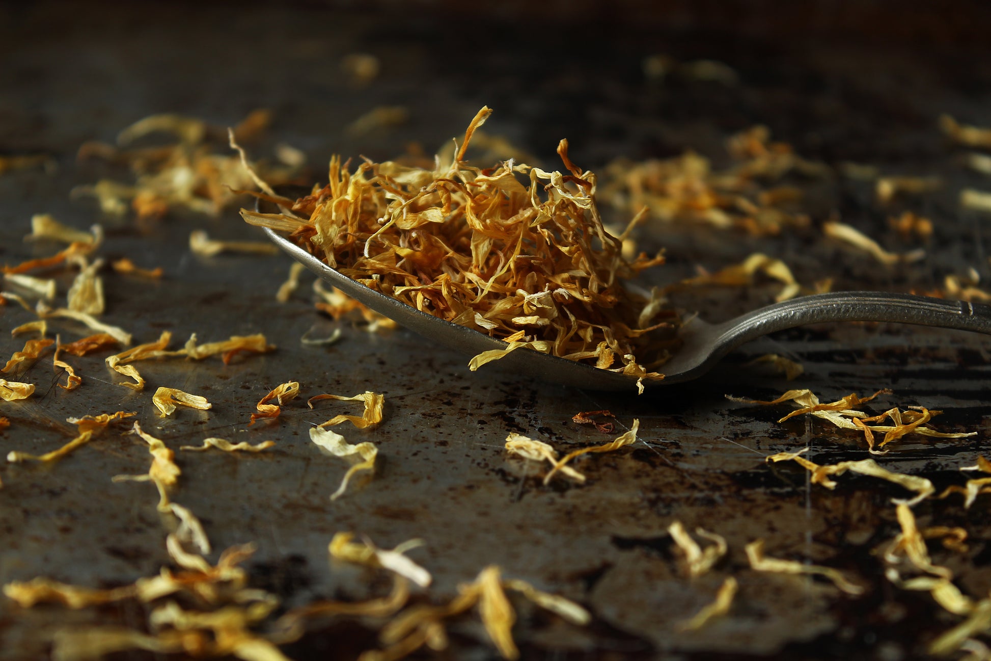 Close up full frame view of calendula leaves on spoon with leaves scattered.