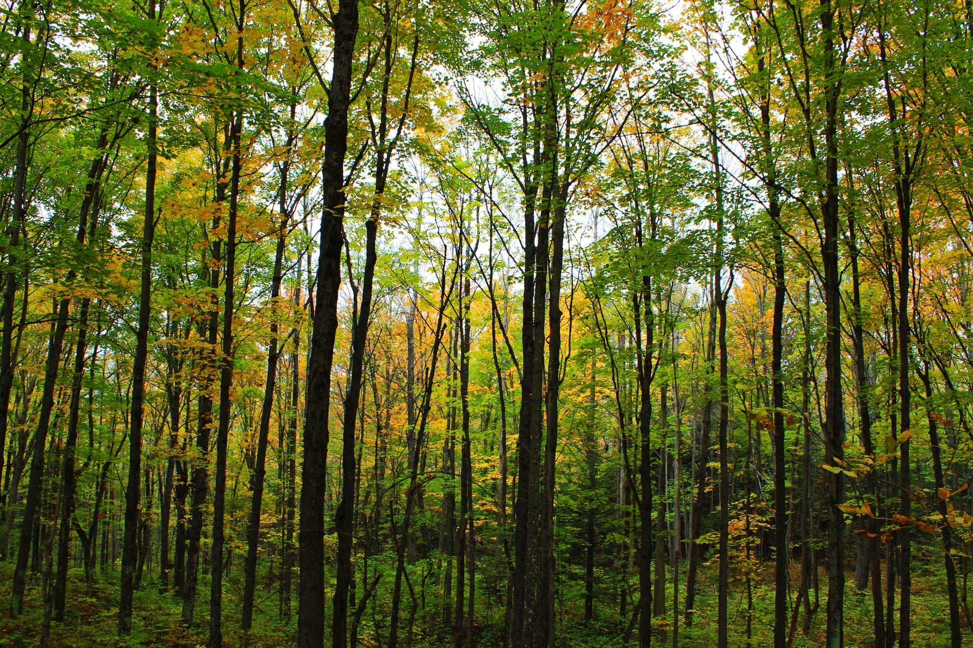 Full frame wide angle view of the Chequamegon forest in autumn. Yellow, orange and green foliage.