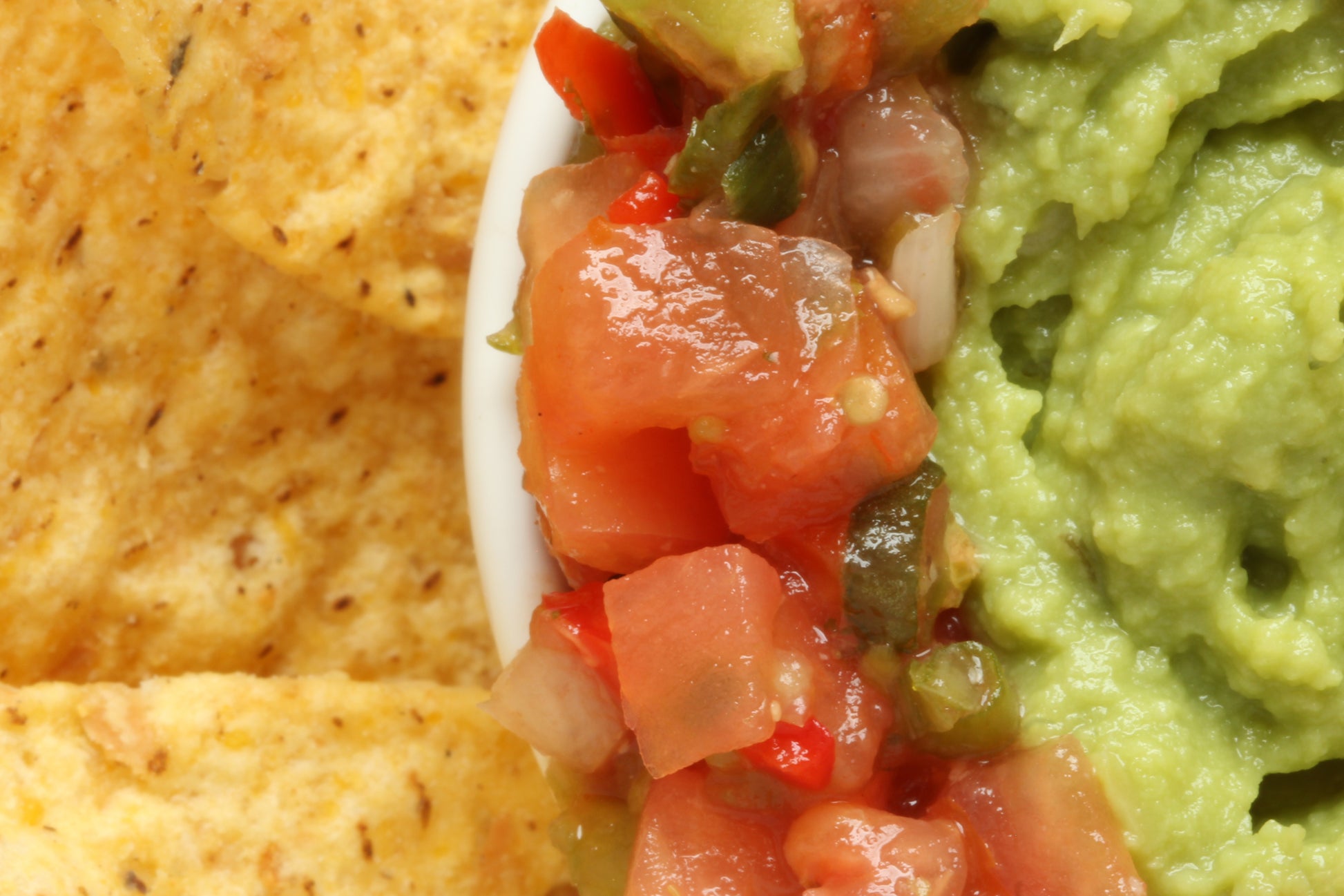Extreme close up view of yellow corn chips, fresh salsa and guacamole.