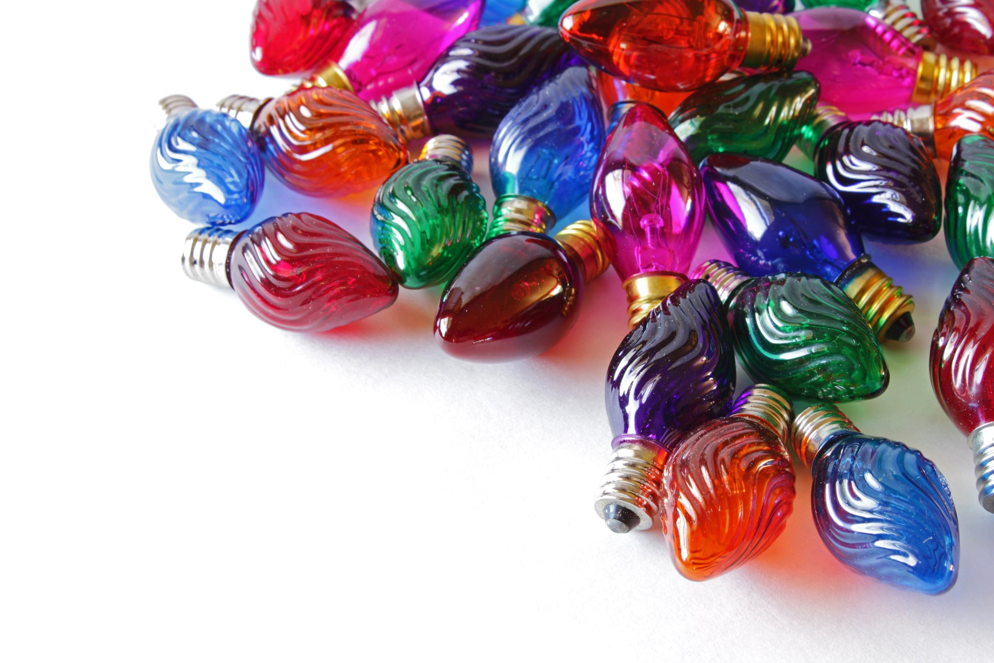 Large group of colorful glass Christmas string light bulbs frame white copy space