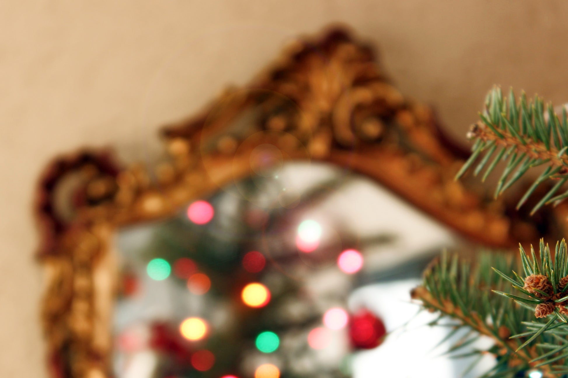 Natural evergreen branches in foreground with defocused view of it's reflection in a mirror.
