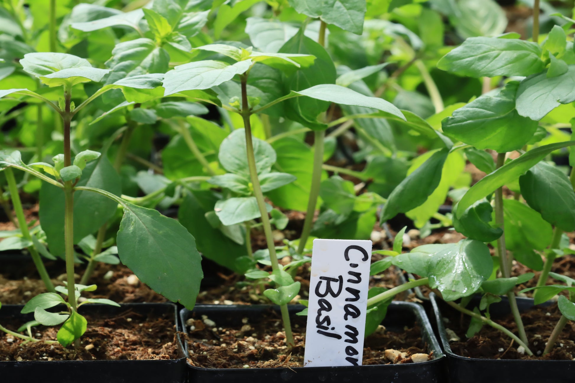 Cinnamon basil seedlings in pots with label.