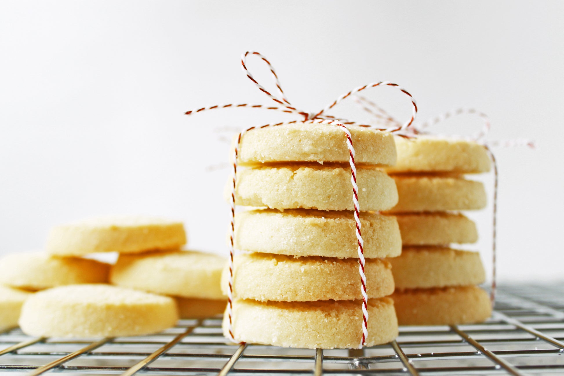 Close up view of shortbread cookies wrapped for Christmas.