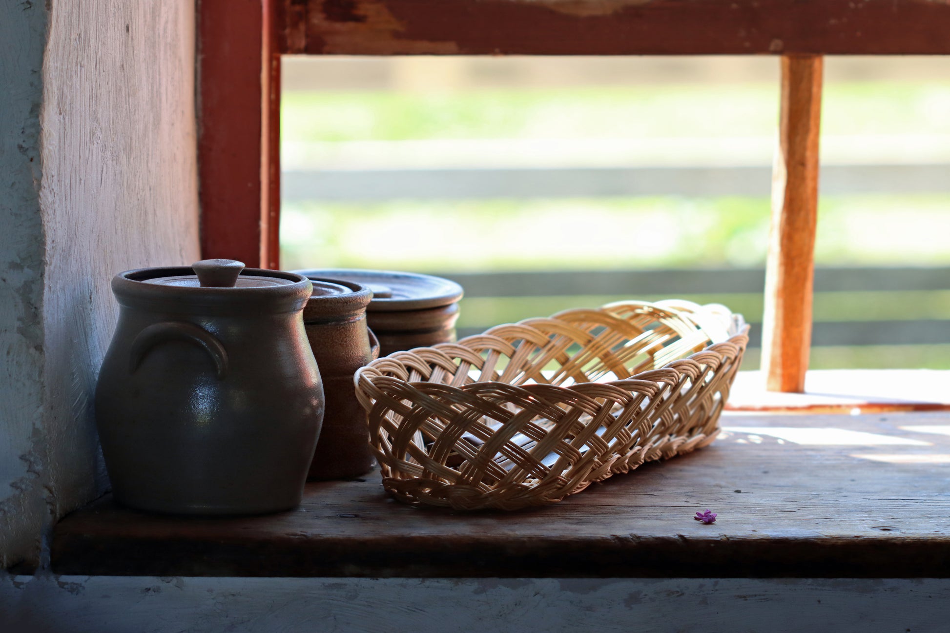 View from interior of stone cottage with crockery and basket. Still life.