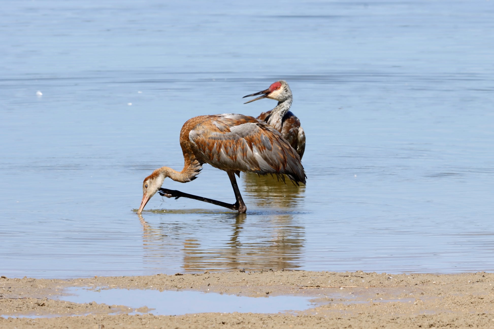 Two sandhill cranes bathing in the shoreline at Ottawa Lake, WI
