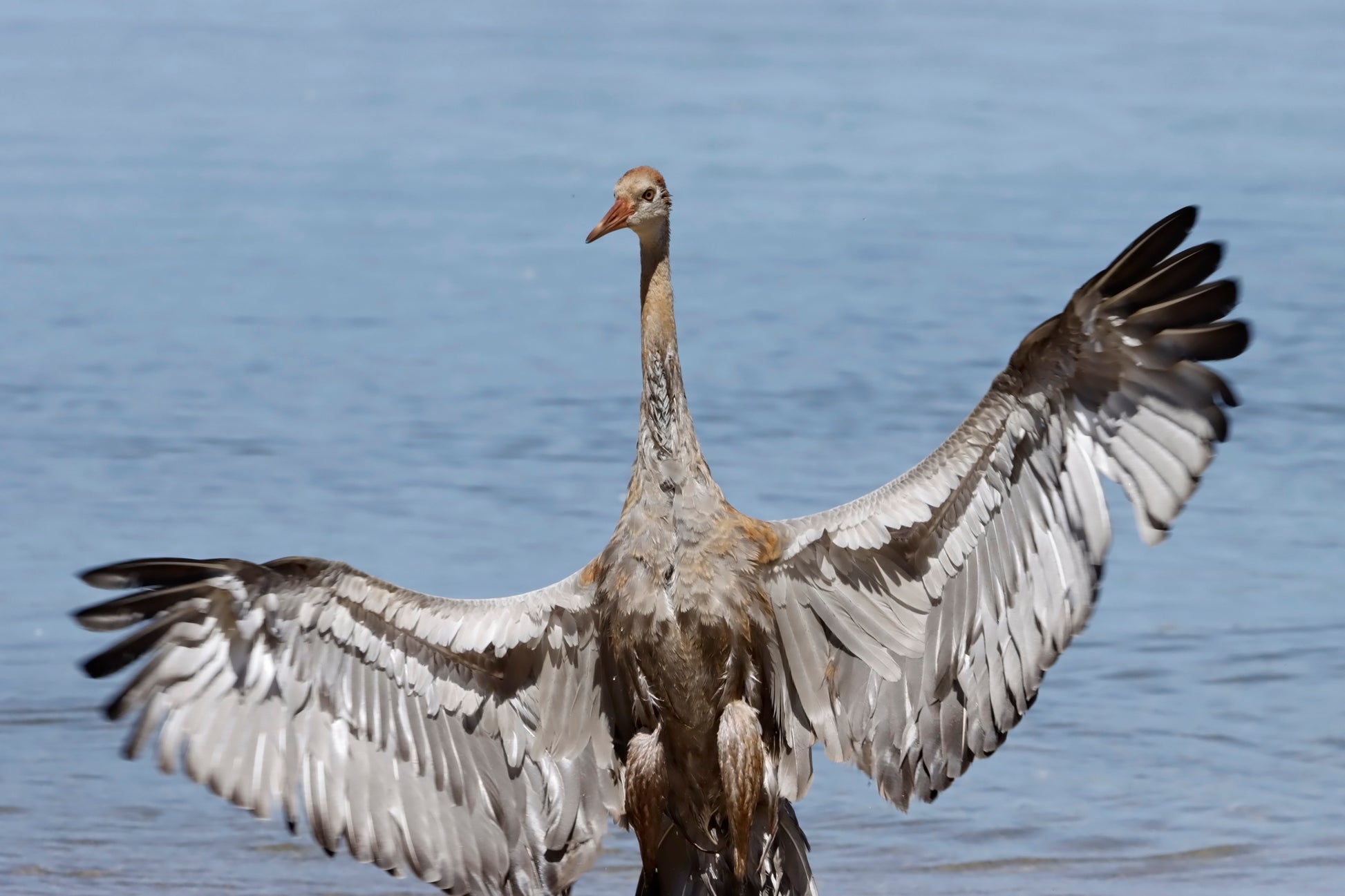 Crane bathing and cleaning his feathers at Ottawa Lake, WI