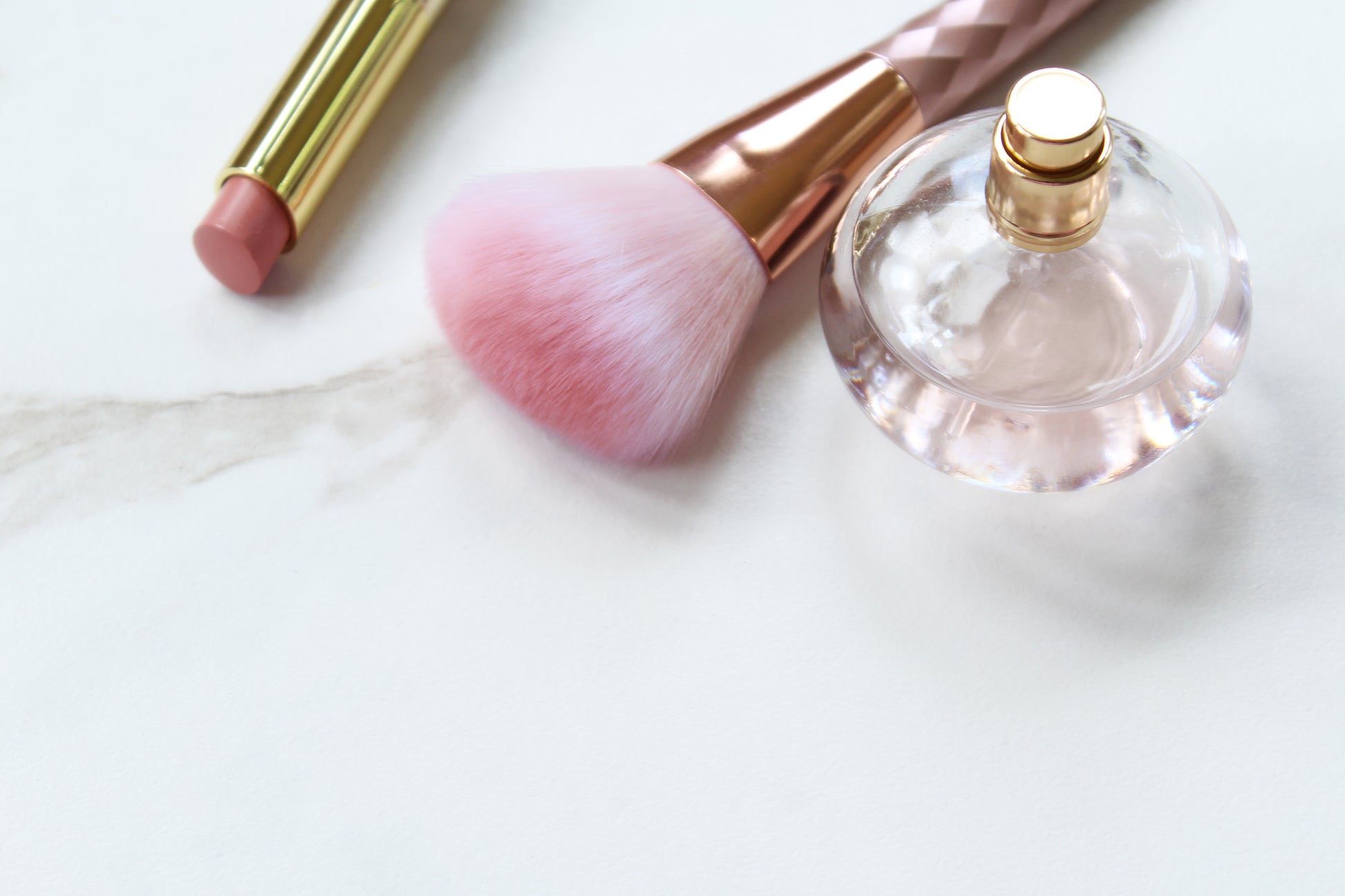 Above view of pink lipstick, make up brush and pink perfume bottle. White copy space