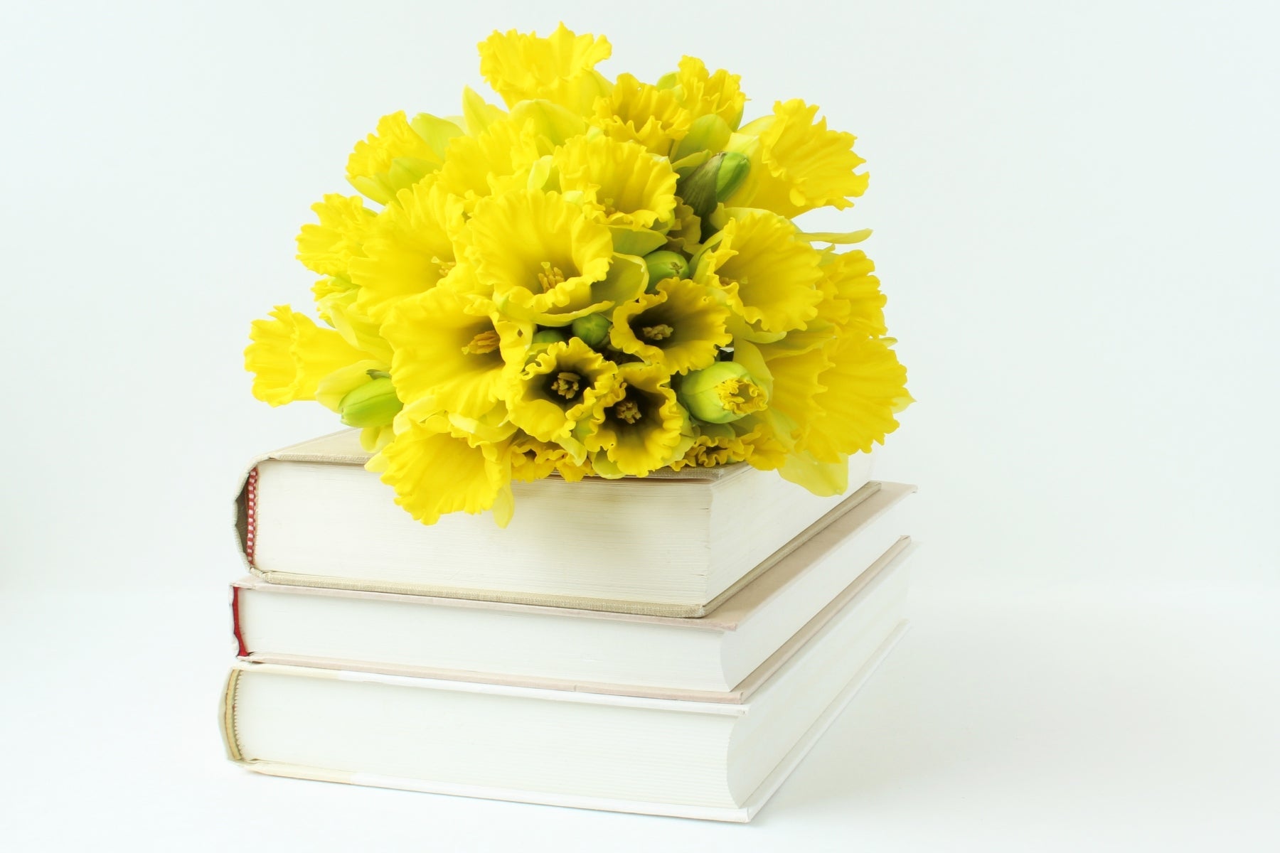 Large bouquet of yellow daffodils on top of a stack of hardcover books. White background.