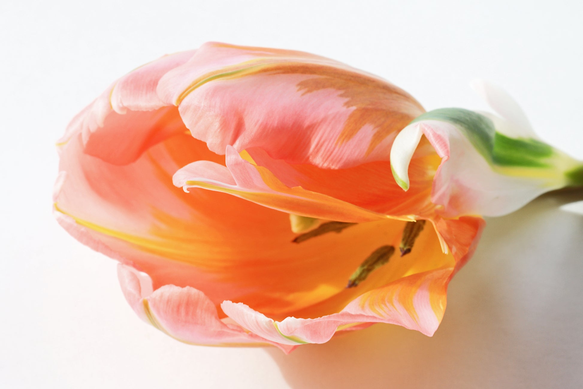 Macro view of a peach colored parrot tulip on white background