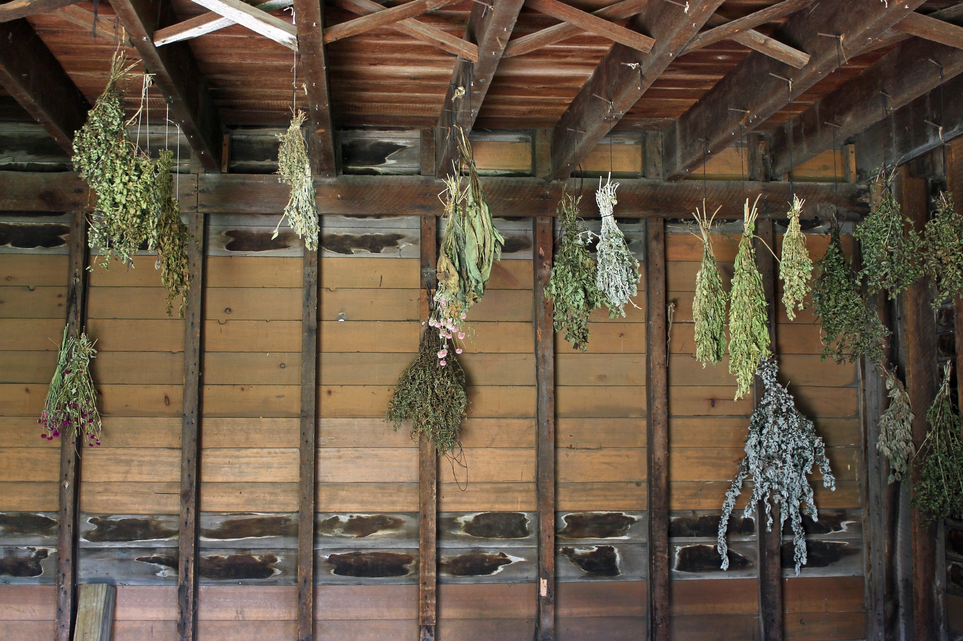 Large bundles of dried plants, herbs and spices hang from the ceiling of a barn room.