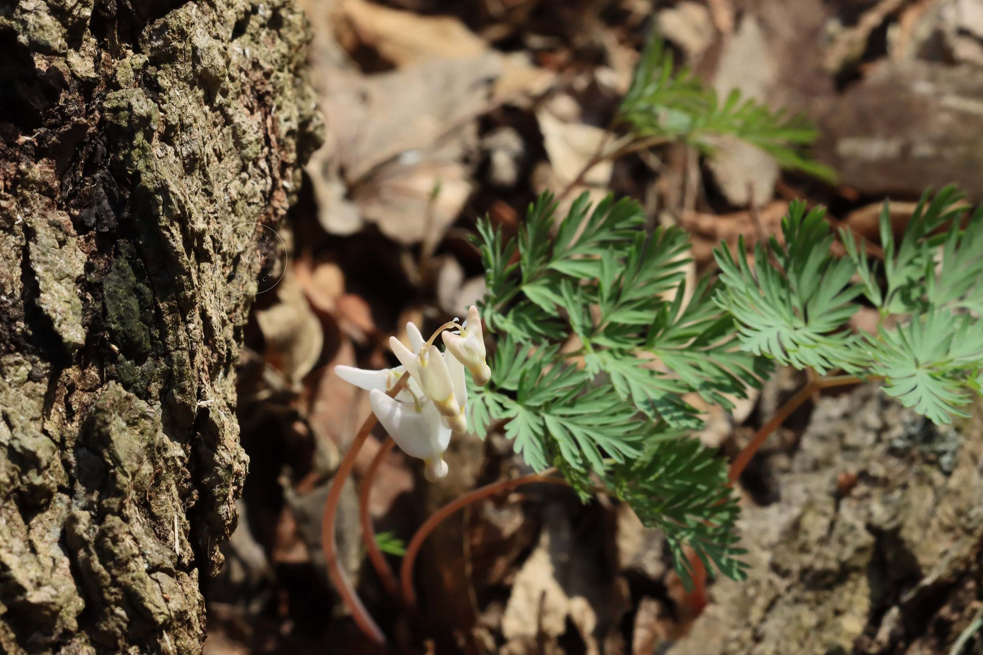 Dutchman's Breeches plant growing alongside a tree. Native. Wisconsin