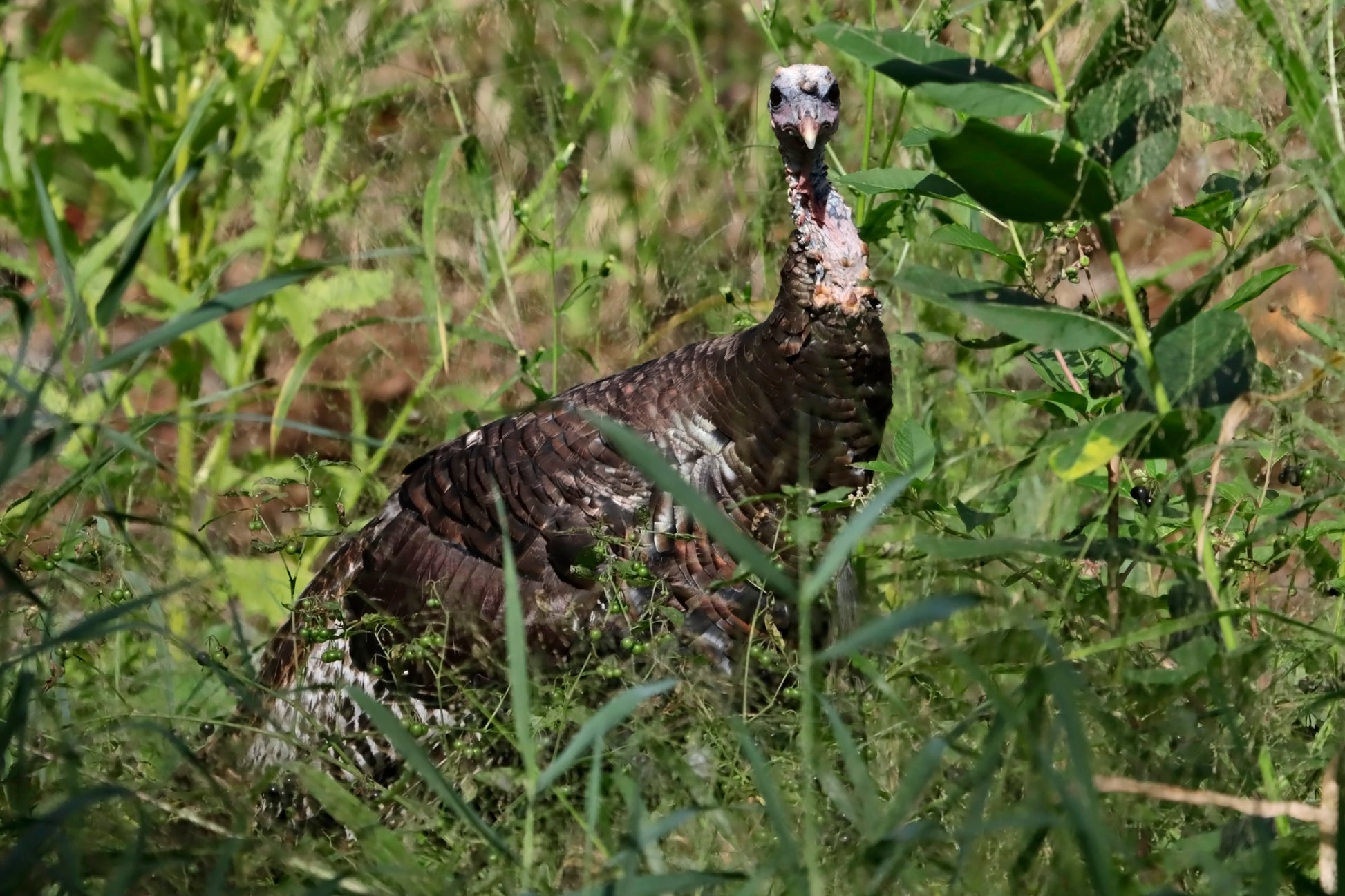 Close up view of an Eastern Wild Turkey hunting for bugs in witch's grass.