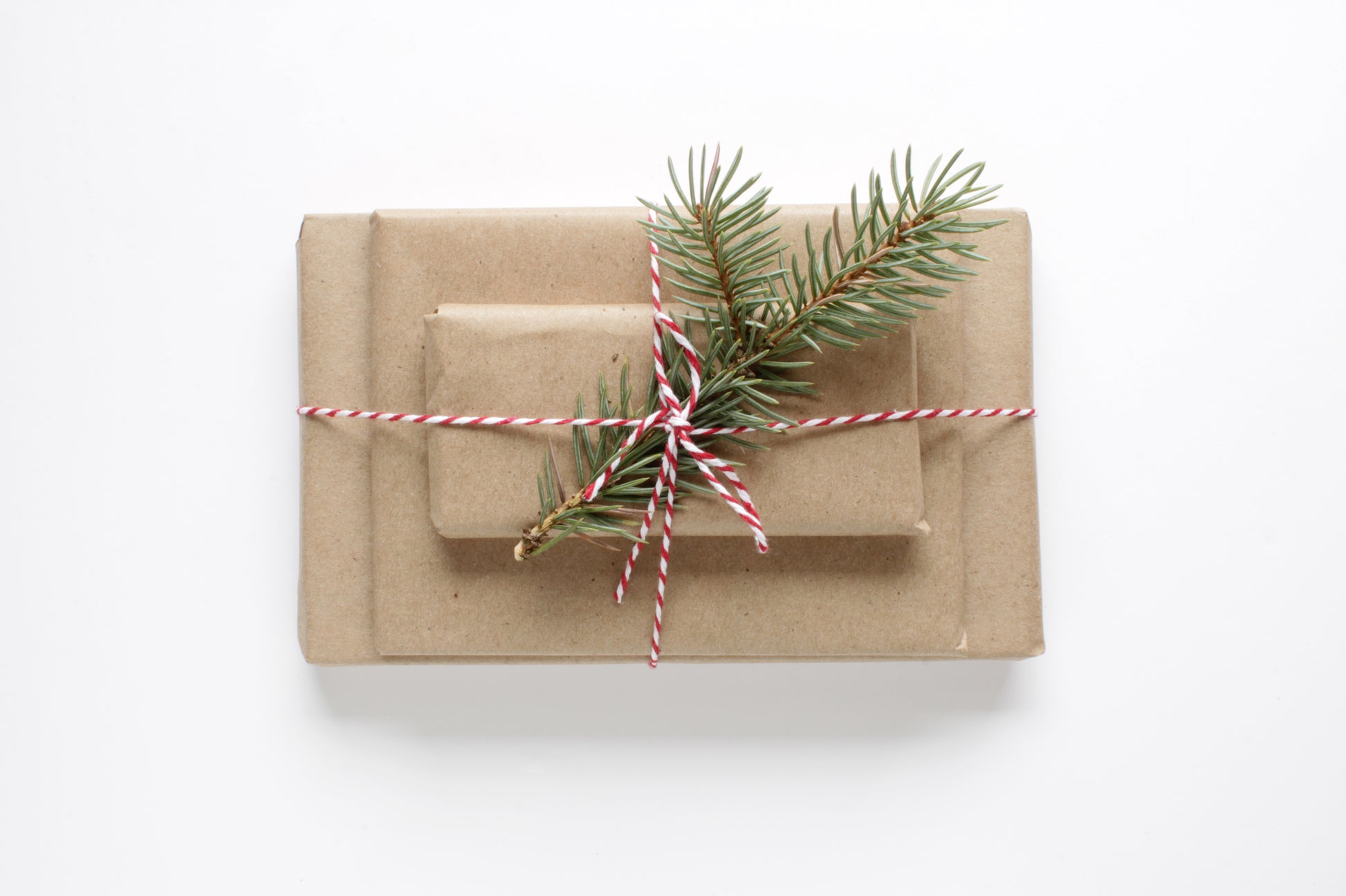Above close up view of packages wrapped in brown paper with string and evergreen bough. White background.