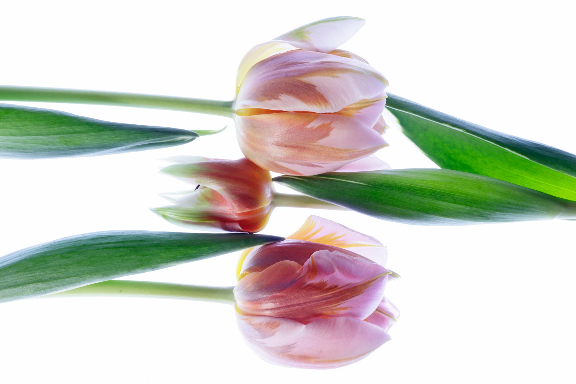 Three multicolored pink tulips styled on white background. White still life fine art.