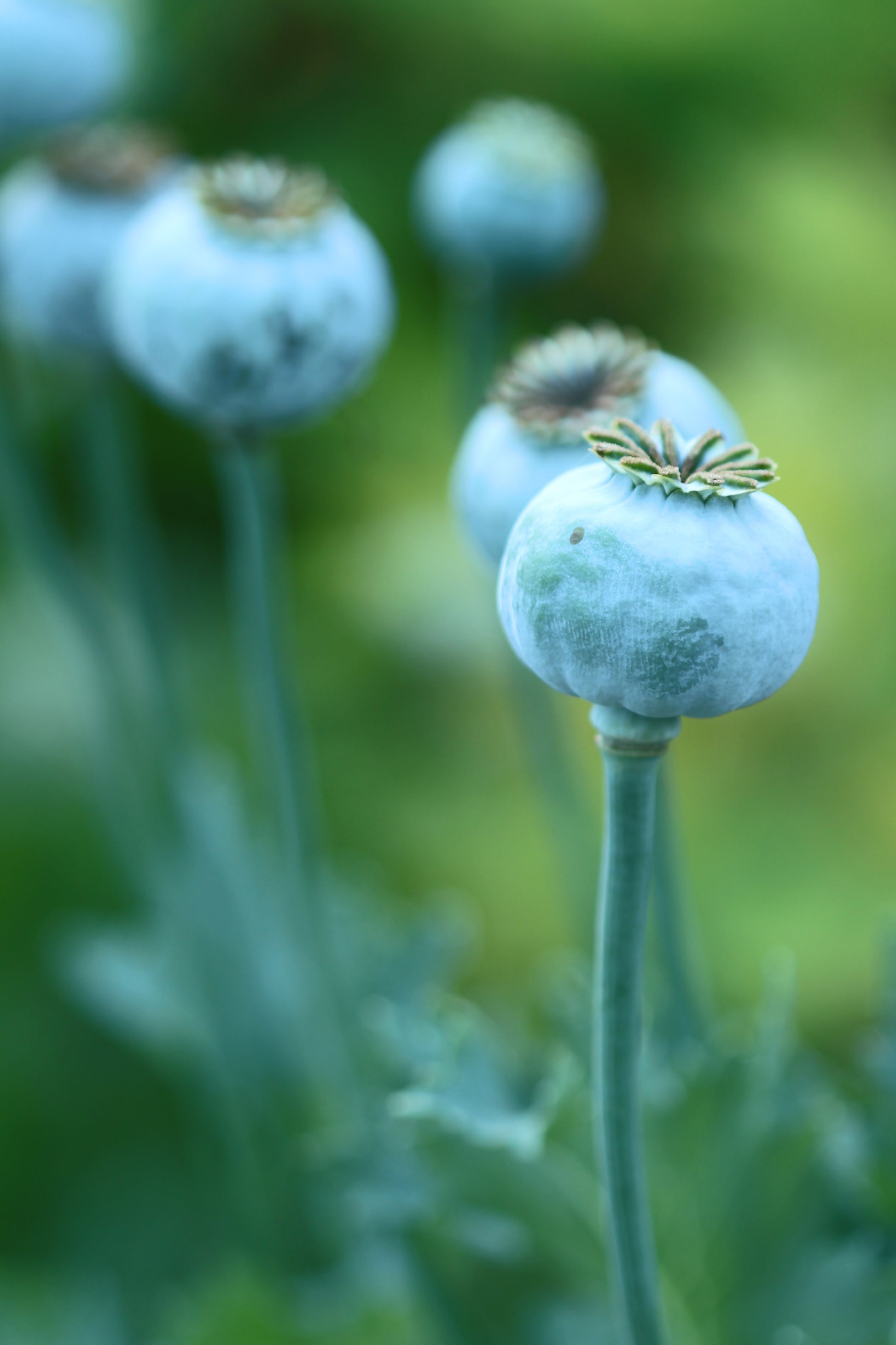 Blue poppy pods against green background . Human fingerprints can be seen on the flower pod.