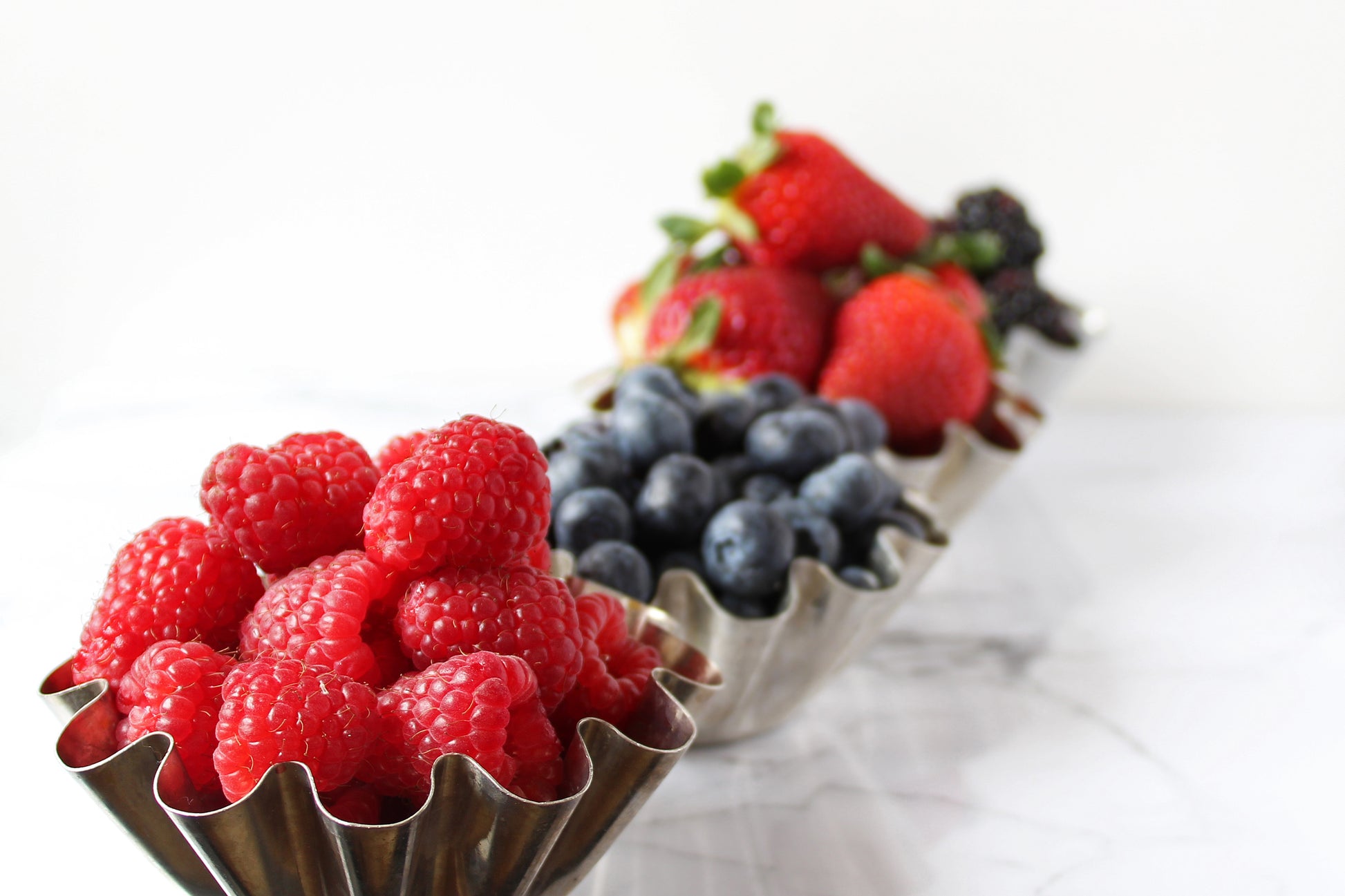 Small tin bowls filled with raspberries, blueberries, strawberries and blackberries on white background