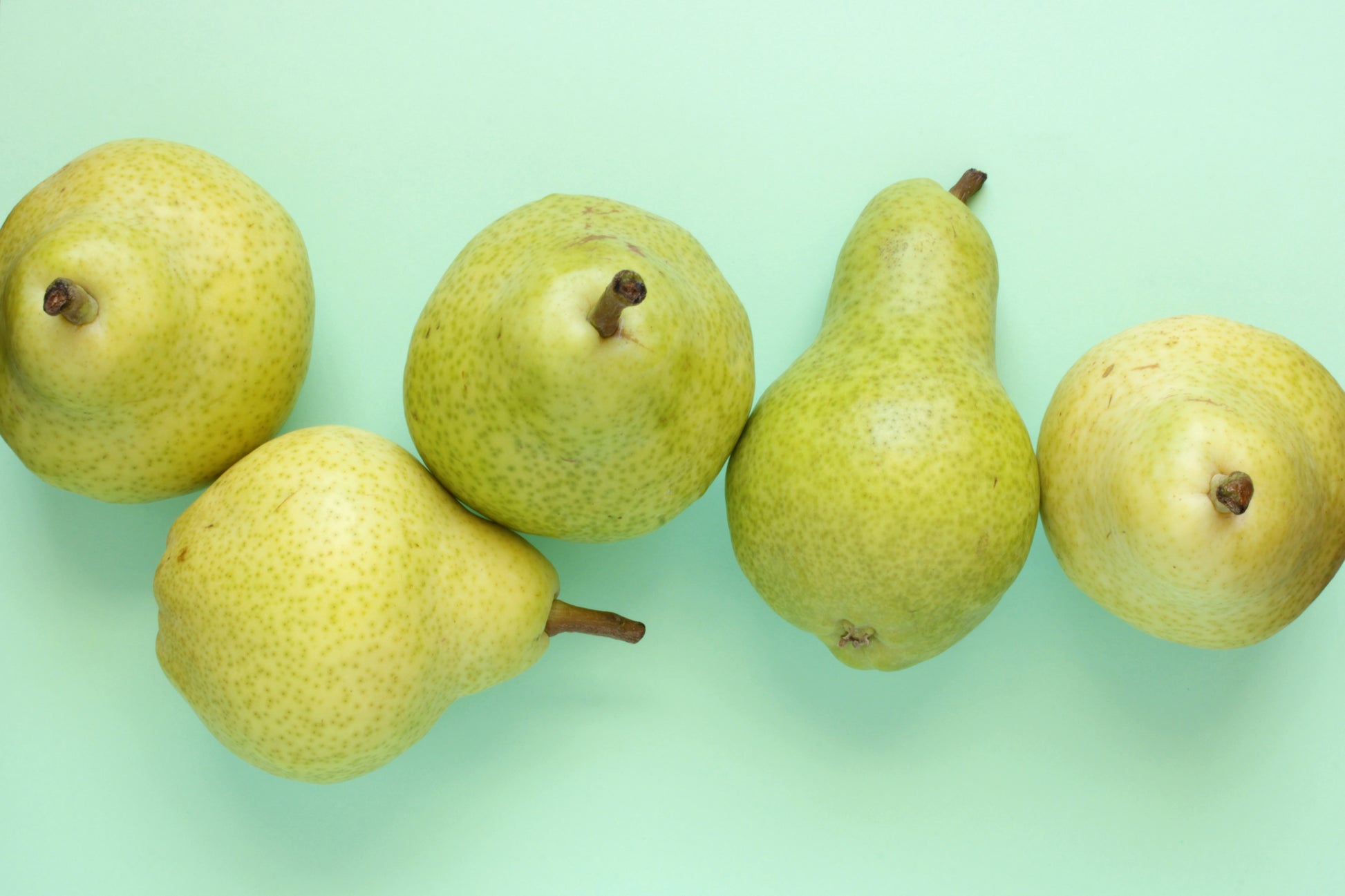 Large group of pears on blue background.