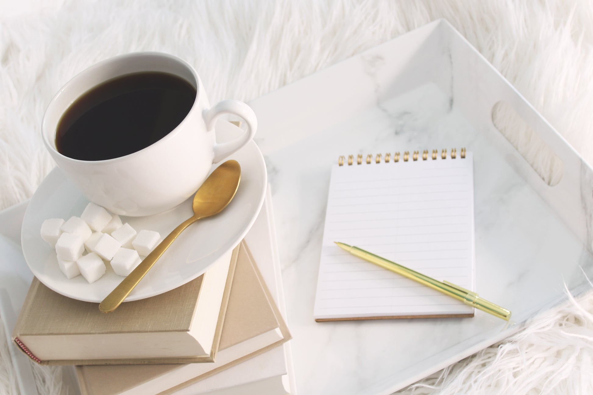 High angle view of breakfast tray with coffee, books, notebook and pen. Faux fur blanket.