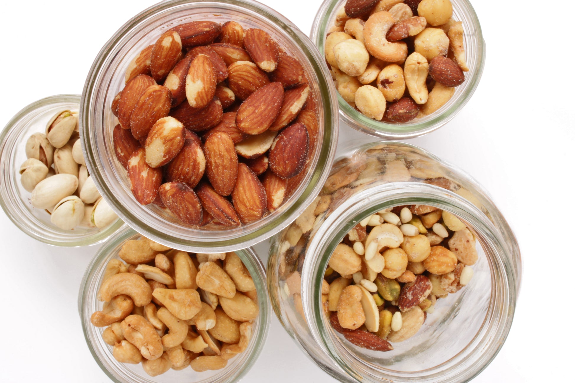 Above close up view of nuts stored in glass jars. White background.