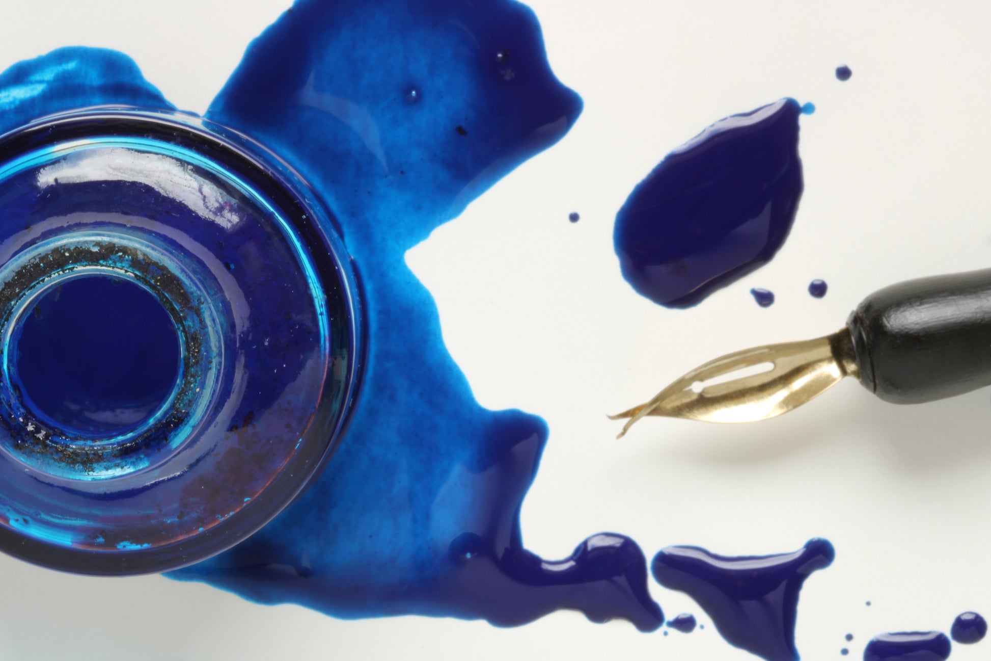 Above close up view of a bottle of ink and calligraphy pen with ink mess.