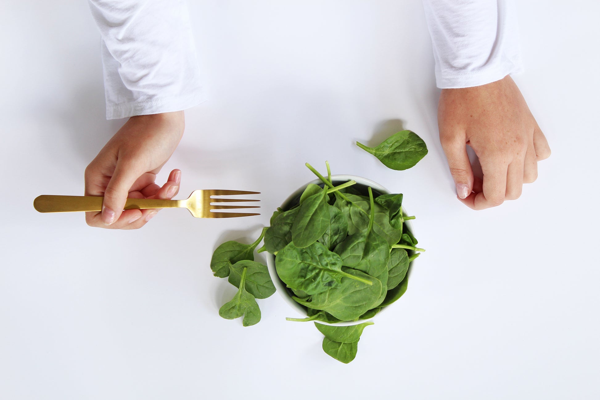 Above flat lay view of female eating fresh spinach