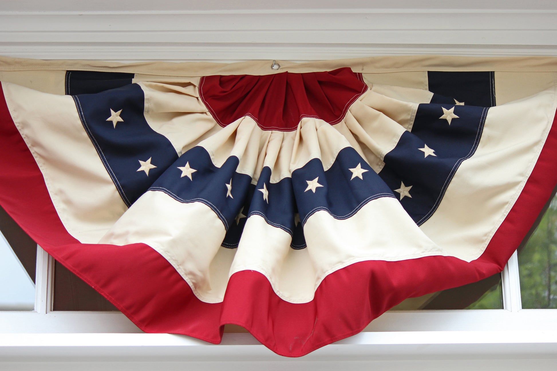 United States Flag bunting hung over a window of a home. Selective focus