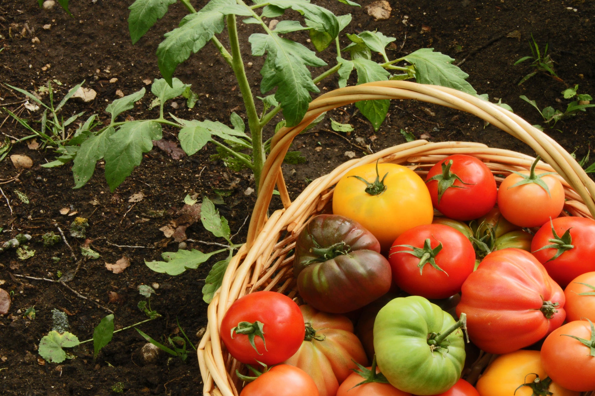 Large basket of heirloom tomatoes in a basket with tomato plant in the garden