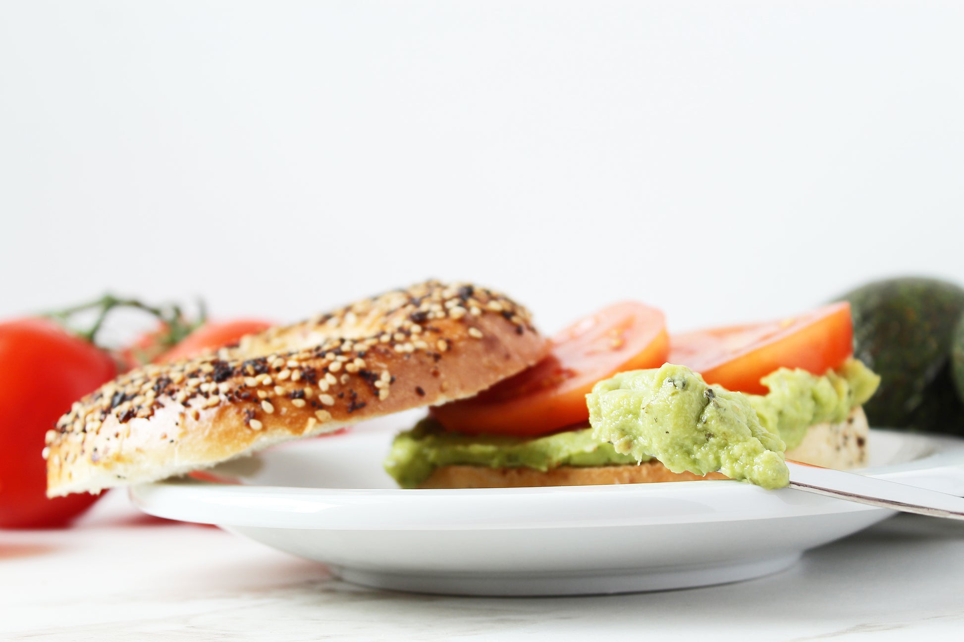 Close up side view of an open sandwich with avocadoes and tomatoes on a bagel. Copy space