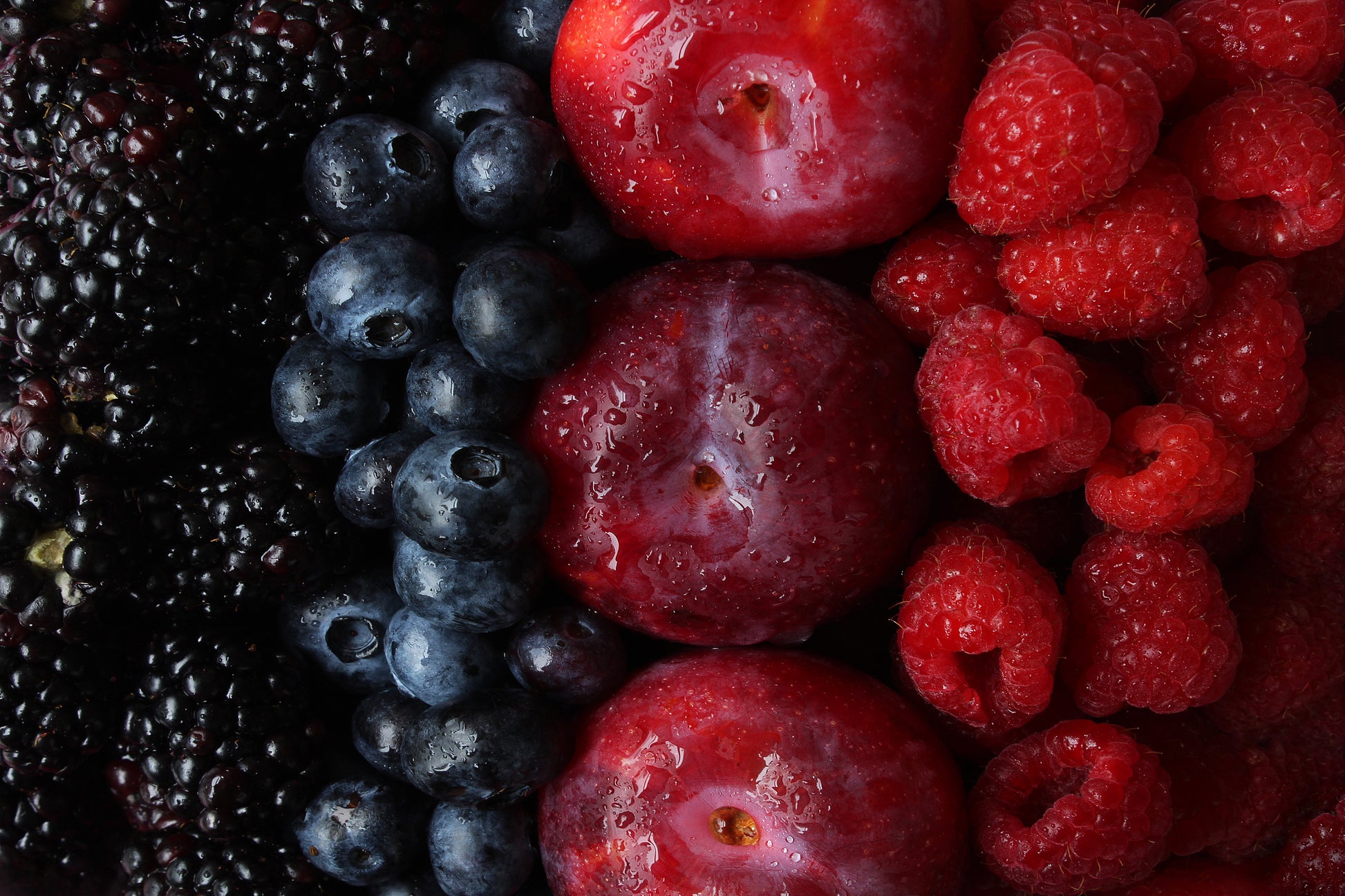 Full frame close up view of fresh blackberries, blueberries, plums and raspberries.
