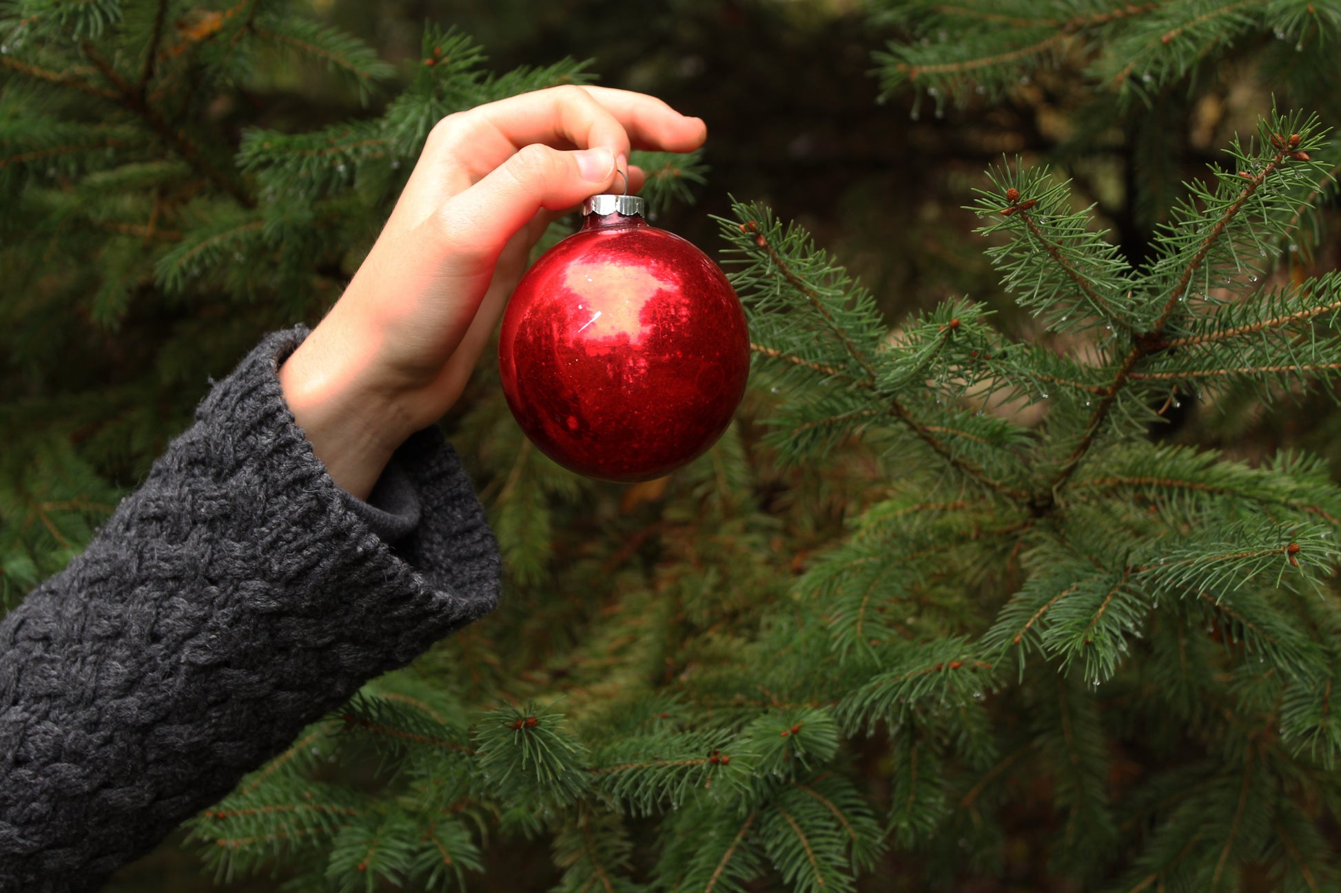 Female hand placing red ornament on a large evergreen tree.