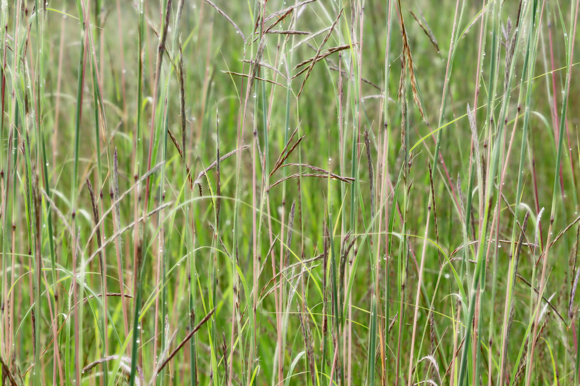 Full frame view of a large group of Big Bluestem with dew drops. Selective focus.