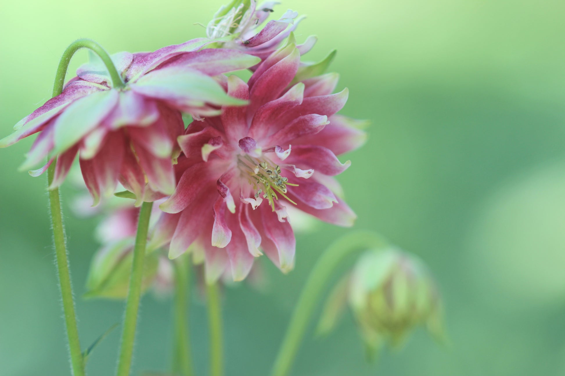 Columbine blooms against green background. Selective focus