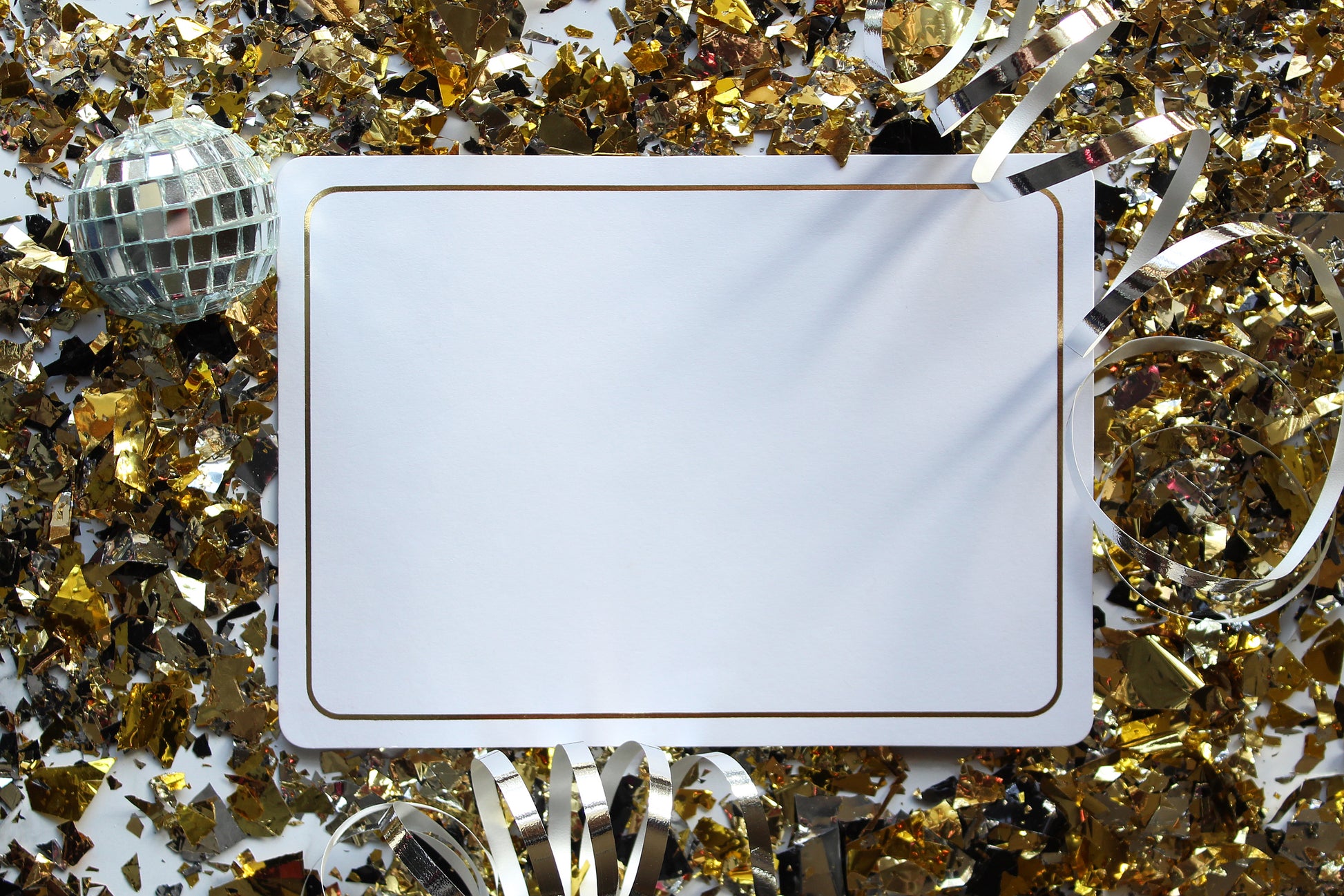 White stationary framed by silver and gold party decor