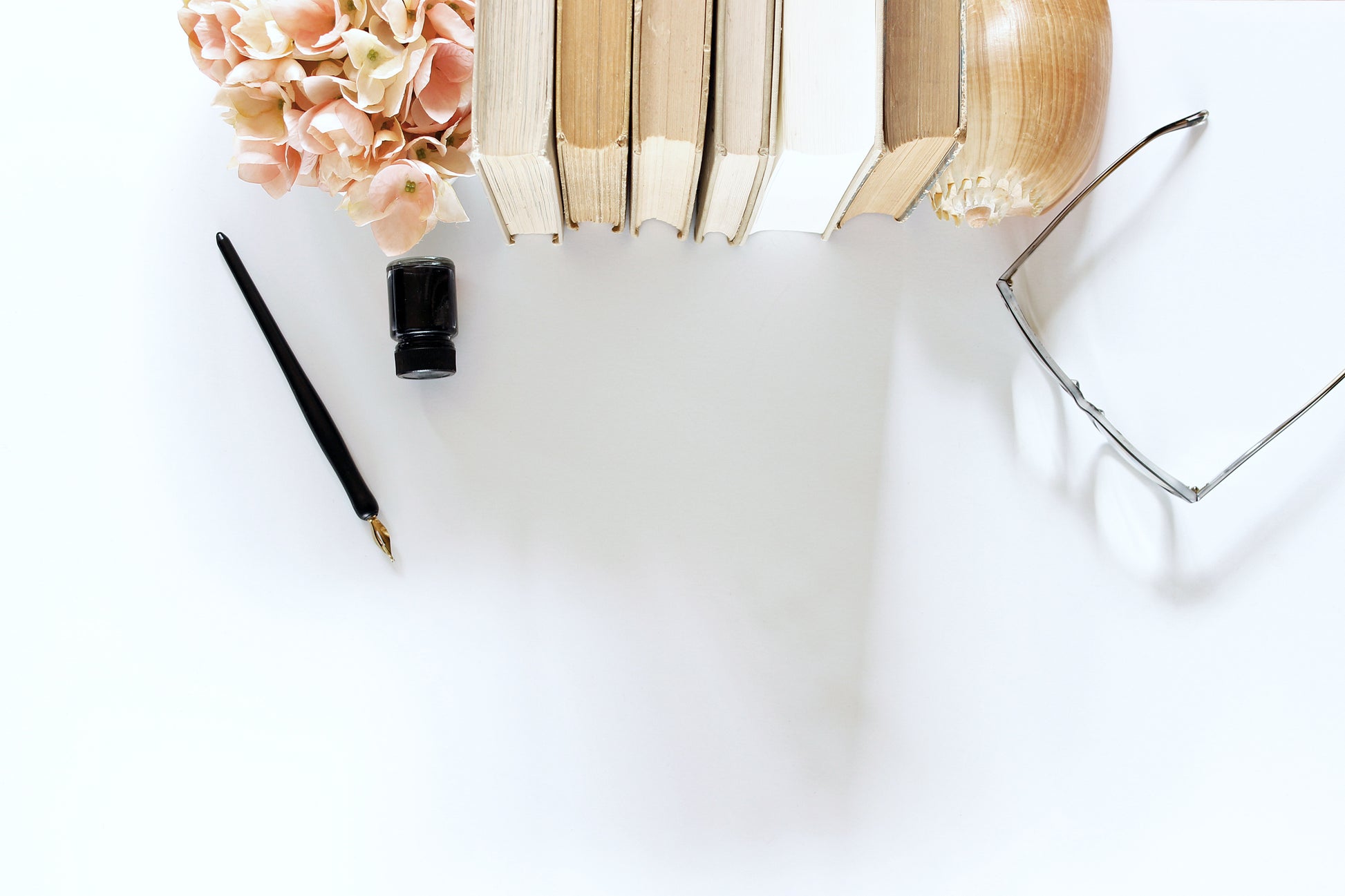 Above close up view of a white desktop with a stack of vintage hard covered books, eyeglasses, flowers, pen and ink. White copy space.