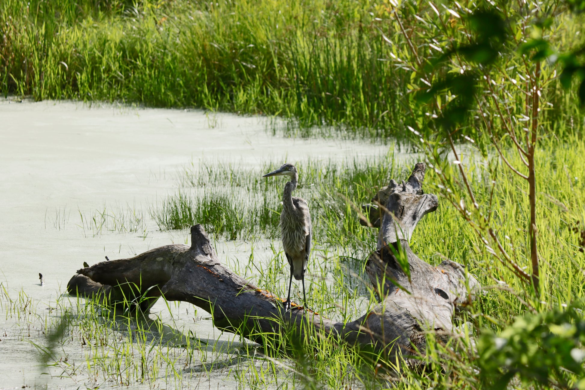Juvenile great blue heron resting in the pond. Retzer Nature Center
