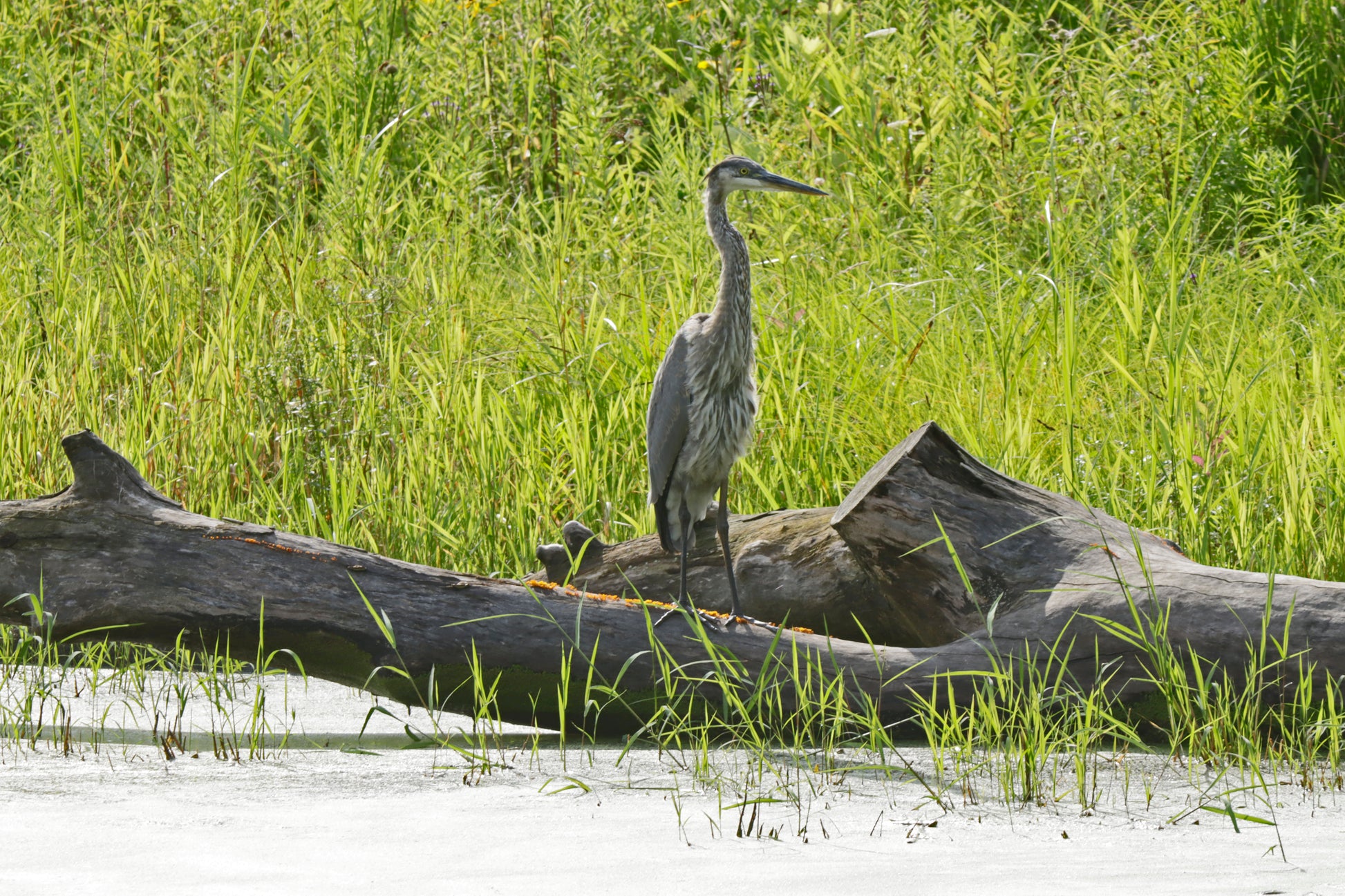 Juvenile Great Blue Heron resting on a log inside the pond. Retzer Nature Center