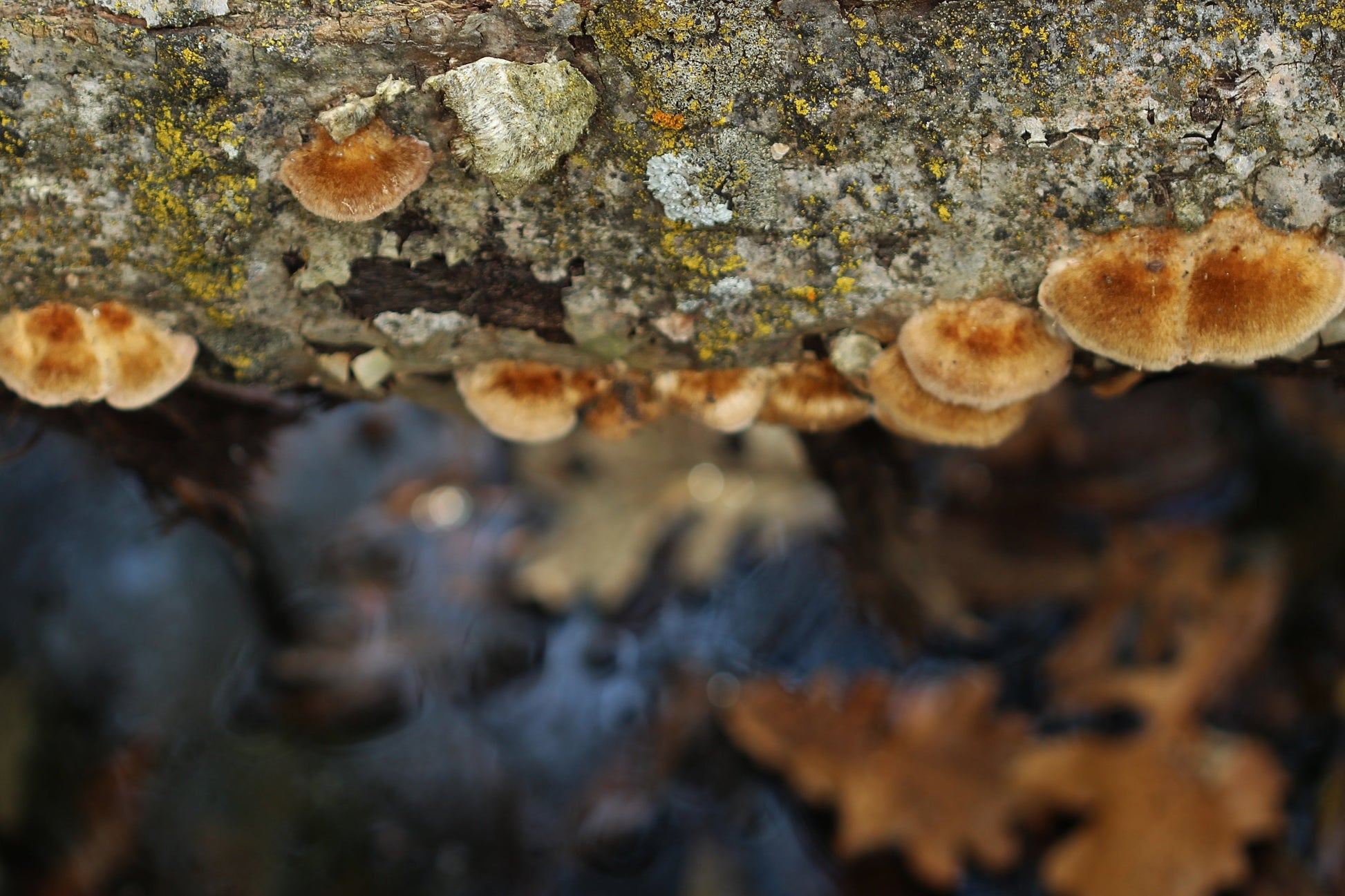 Bracket fungus growth on the side of a log above a stream. Fall colors.