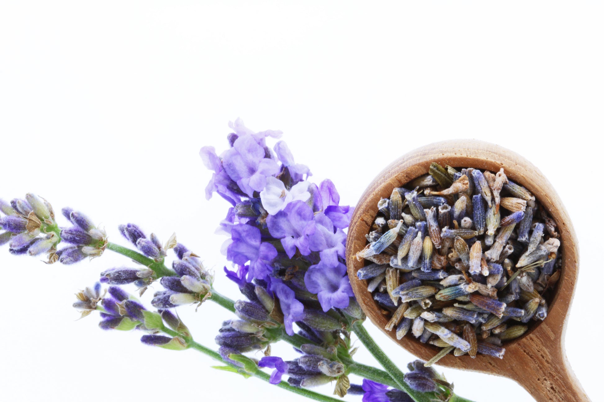 Close up view of fresh lavender flower with dried lavender on a wooden spoon. Copy space.